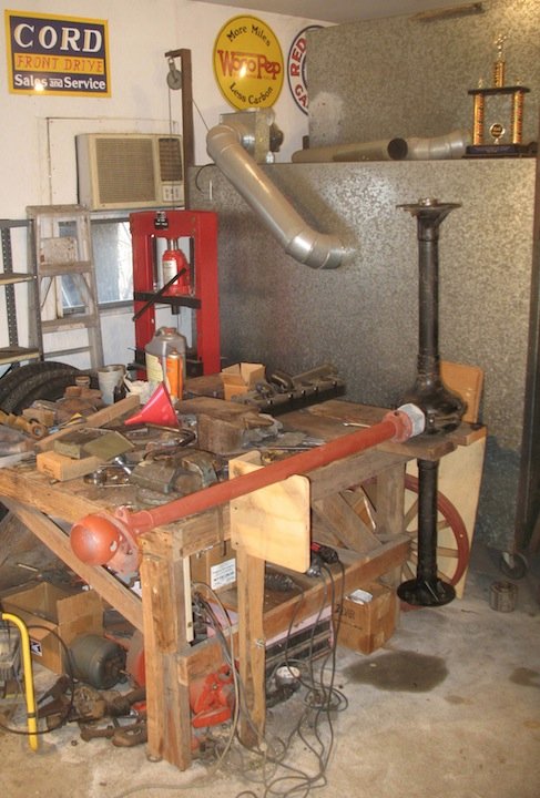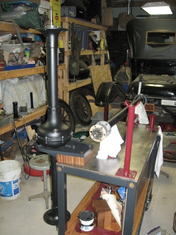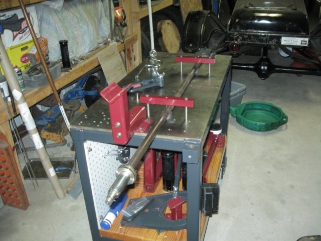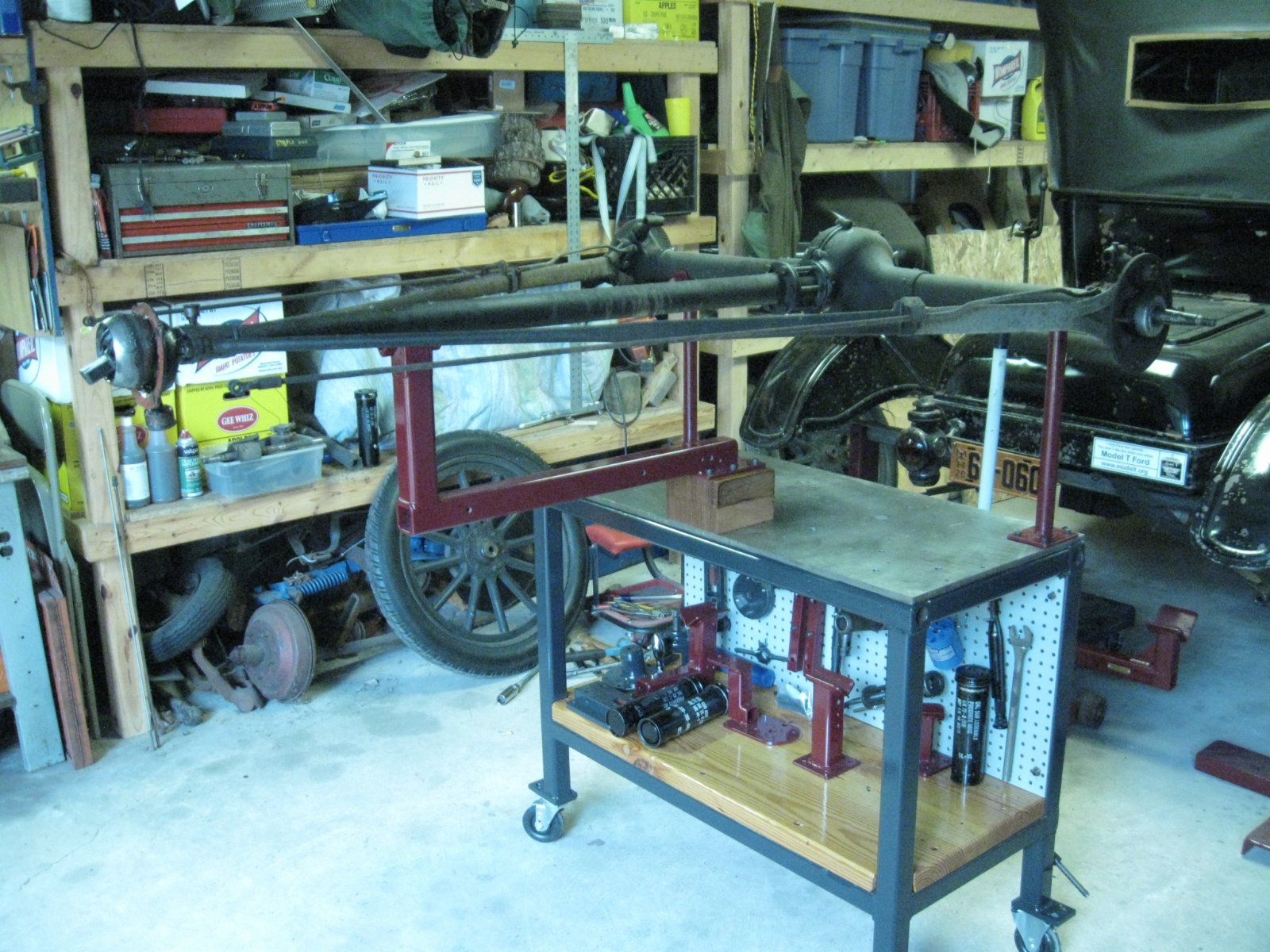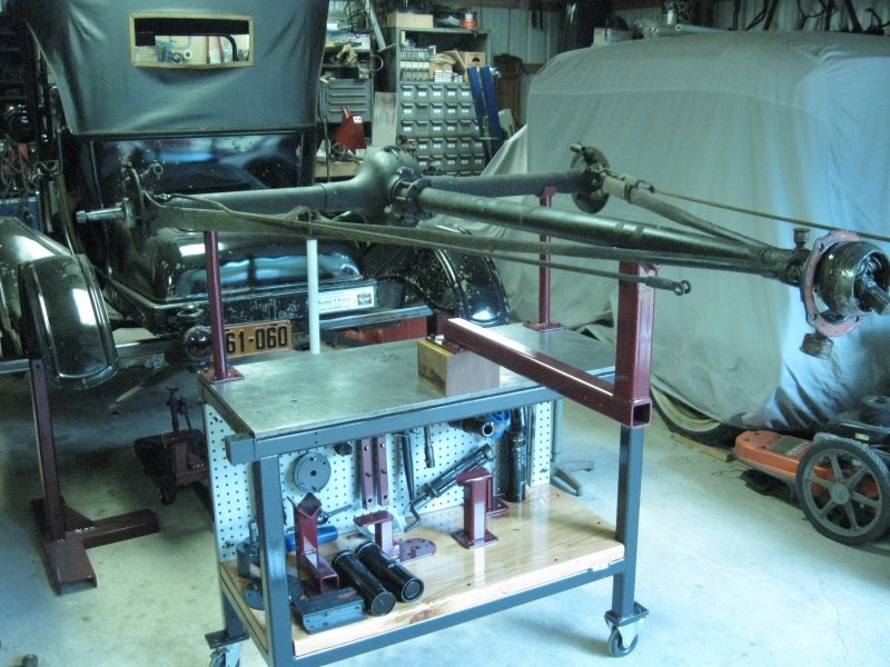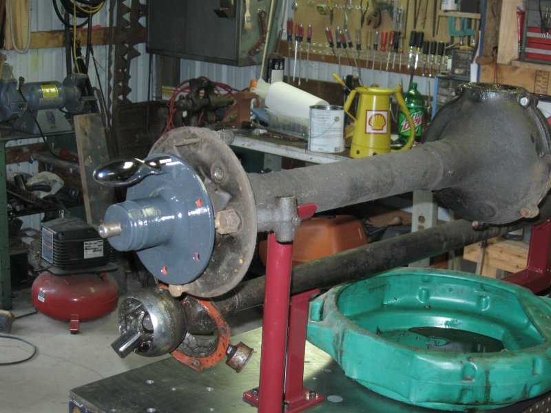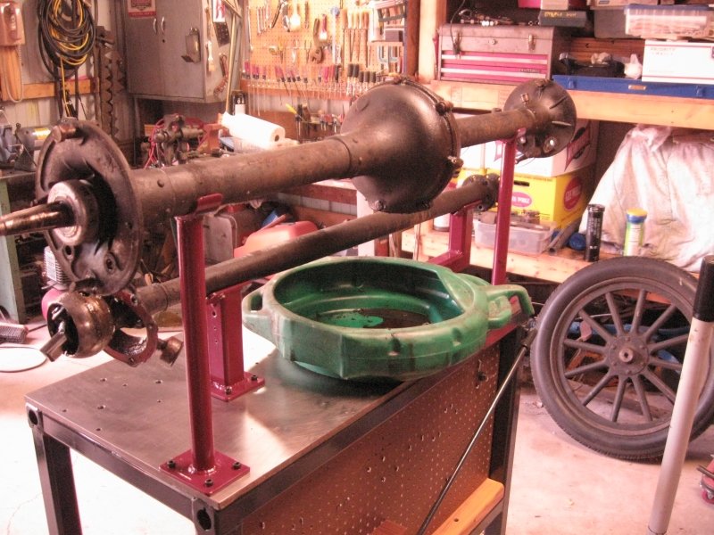All-in-all, it is a nice compact set-up that is solid and stable, yet easy enough to move around, even with the axle on the table. After you are done using it for rear axle work it can be used as a solid work table or workbench or move out of the way. It does need a small tweak or two, but nothing major. For it's first trial run it worked extremely well and made the job easier than I ever remember. That 3 hour and 28 minute time for an axle overhaul in the Ford Manual may be in reach. I will post some other photos of it in use.