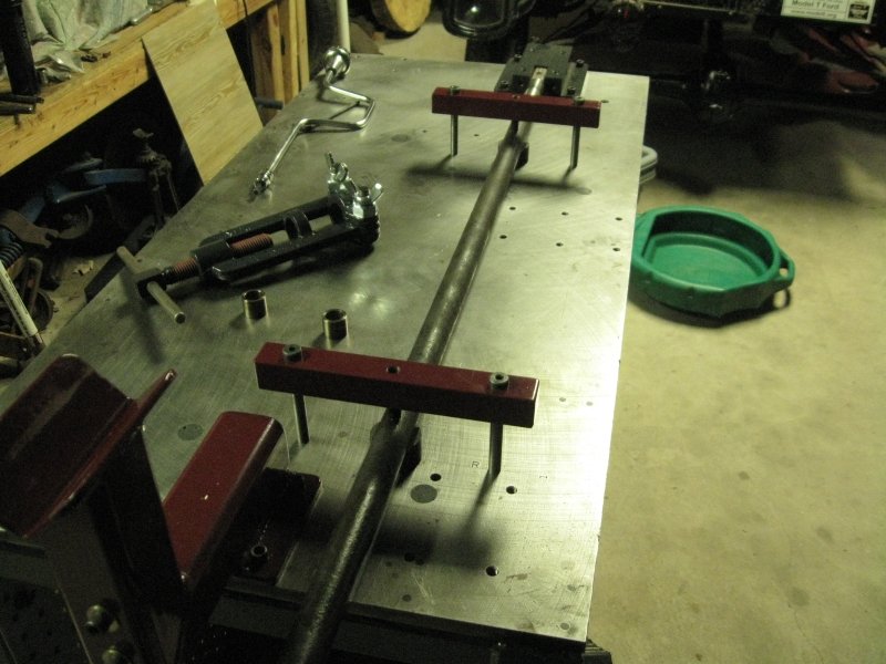 Poor man's rear axle work table and tools. Just doing one axle. Flipped the old bushing over to push the new one in - used a roll of cardboard between the threaded rod an new bushing to keep it somewhat center and protect the surface of the new busing. Removal tool is as described in the Ford Fix.