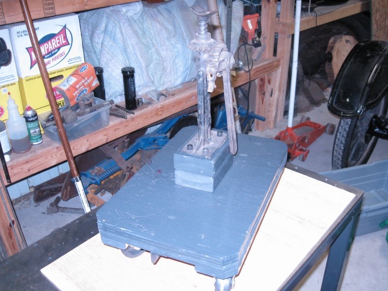 Notice the winch, there was a cord to a battery mounted on the bottom rail. It also had wheels to roll it around the shop and short legs to set it down on the floor to make it more solid. Just let the air out of the tires to lower it and blow them back up to move it.