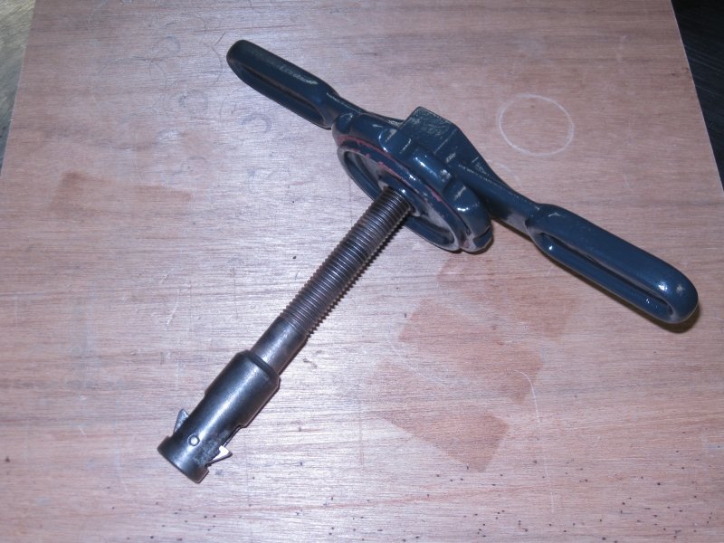 Please forgive the "modern" wing nuts and spacers on the Stevens tool, the originals have not come back from the plater yet. The spacer that fits over the end of the drive shaft and the tool I had made, and they were copied from originals. While they do "work", they do not work well; no fault of the machine work, they are just too short and should be designed a bit differently. I am going to have some different ones made that are longer and a bit different (more solid). The only problem with this tool is that it wants to spin on the drive shaft as you tighten it up. Also, you need to remove the handle and use a wrench on the end, that 5/16" straight rod handle won't cut it.