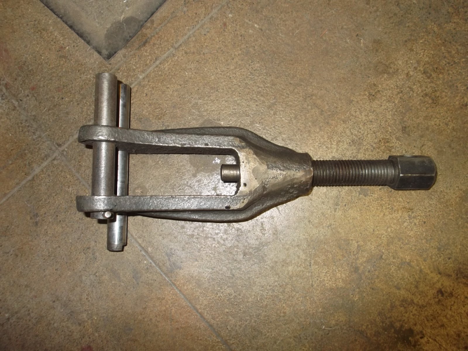 The screw goes on the threaded end of a Model T spring perch while it is installed in a front axle. Two steel pins go through the 4 holes in the lower part of the puller holding it on the axle. Then the screw is turned, pushing the perch out of the axle.