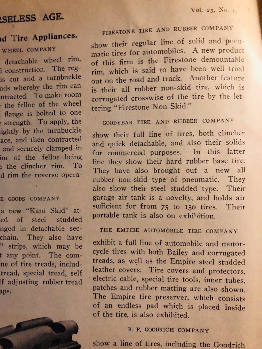 Here is the write up from the section of The Horseless Age, Jan 1909 of the tire cos. products on display, note the mention of Firestone demountable rims.......and of course, the famous 'Non -Skid' tire with the letters in the tire for traction.