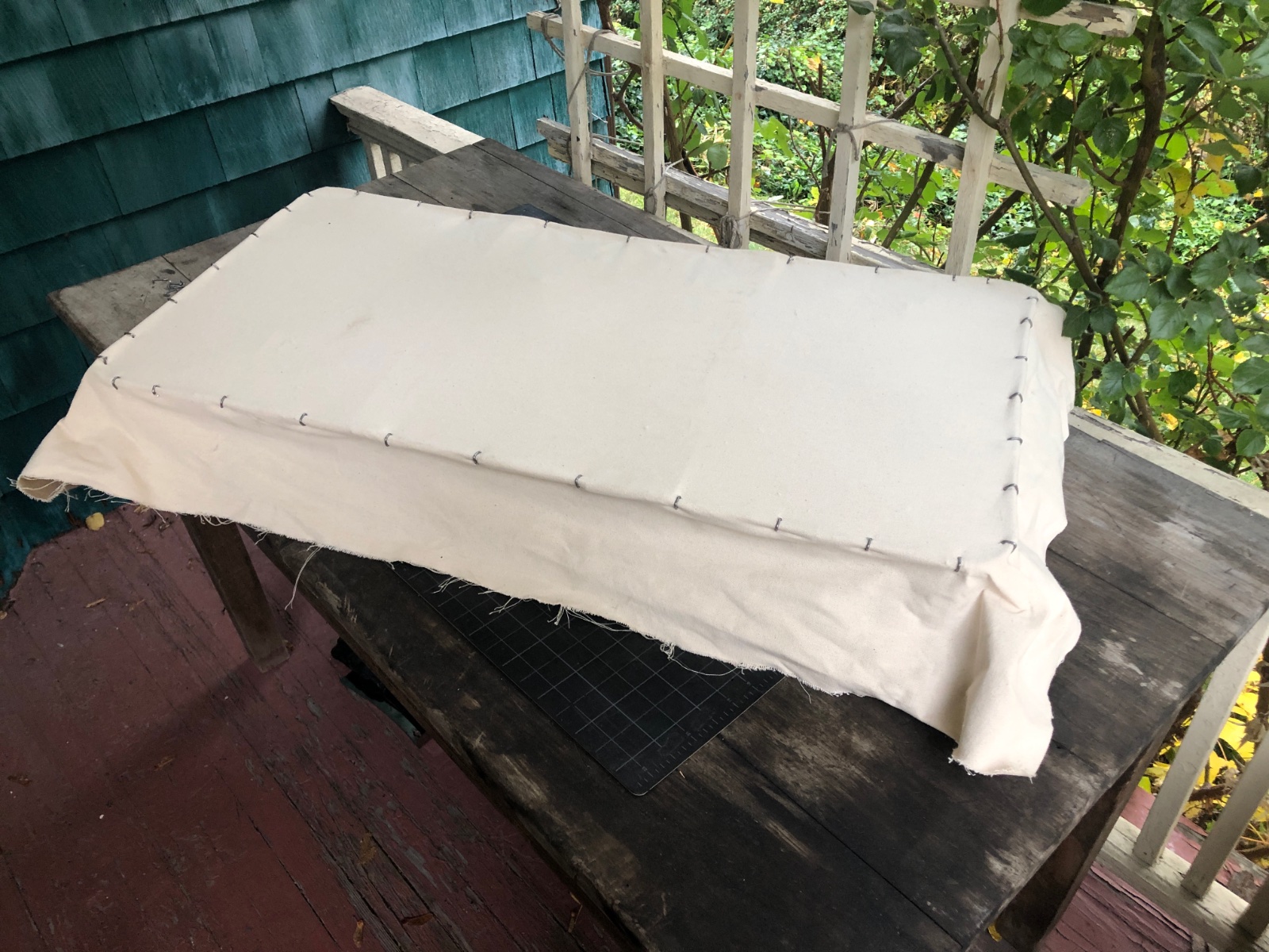 Just thinking aloud for myself after seeing this process: Perhaps some store-string and a large eyed leather needle could fasten the canvas to the top of the spring in a long loop around, satisfy folk (I get both sides and understand but we can’t quite run the new material with the canvas thru the sewing machine again, can we?) and then the folded canvas skirts on the bottom could be secured at the bottom by more string to keep the canvas in place and the new material away from ever getting into the springs?