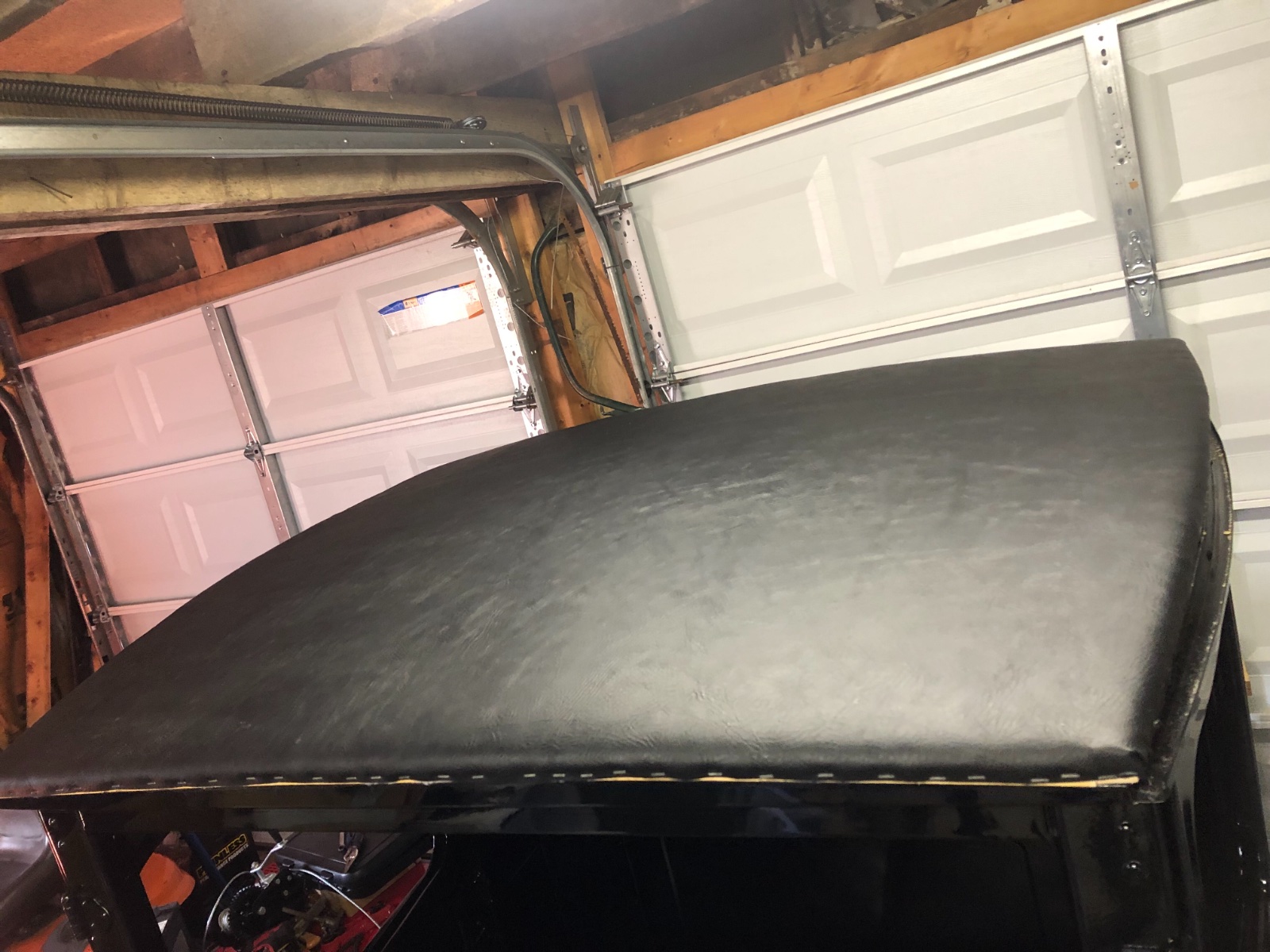Got the top layer on this morning. The hiddem welt should be in this afternoon and then it’ll be done. Not too shabby if I do say so myself. I even have a good looking headliner that breaks up the monotony of all the black! More to come this evening.