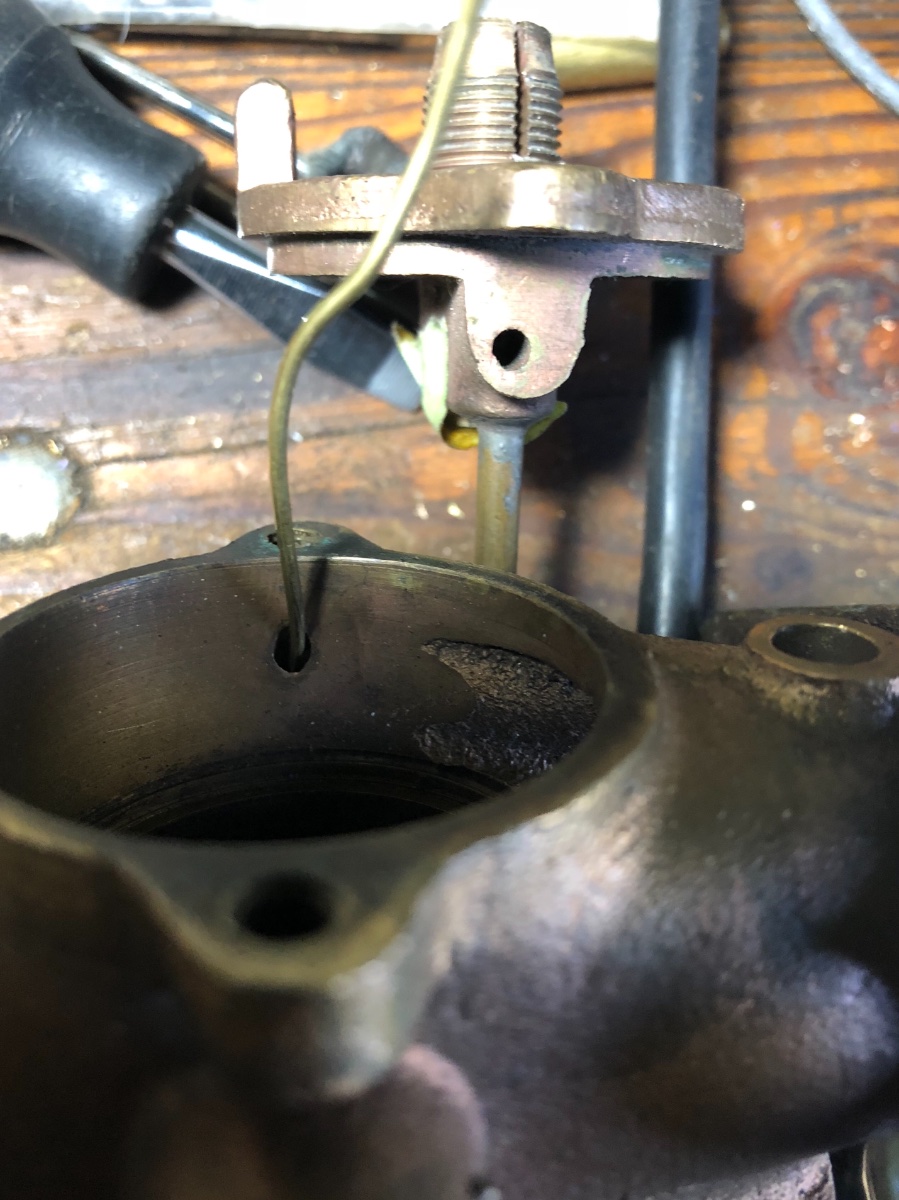The 1913 Holley S was similar but the pick up tube was soldered to the mixing chamber cover and the holes for the gas to flow were machined to line up for gas flow. The air bleed, which also served as an overflow drain, was a hole drilled from the bottom on both the G and S.