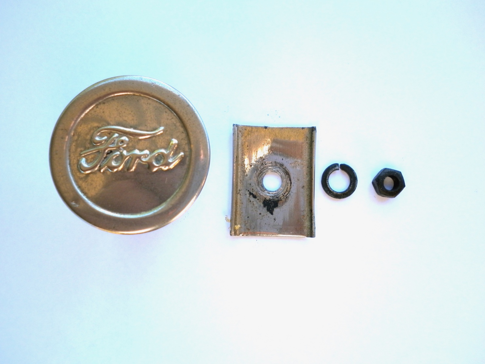 The medallion had the nickelled cover rolled over a base piece that was the bolt that secured it to the bumper bar.