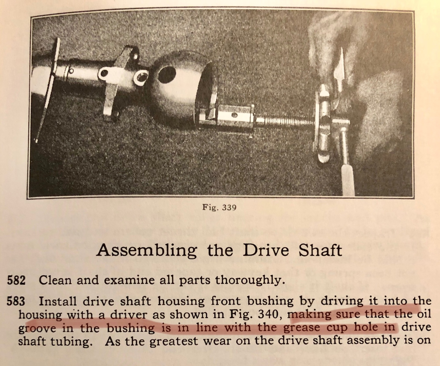 There should be a groove for the grease to travel along on the inside of the bushing that runs from about where the hole will be drilled to the front. That groove needs to be lined up with the hole. Not all types of bushings sold have one because more often then not when a used driveshaft is used, the drive shaft is worn undersized so there would be too much clearance and lots of space for grease to flow. One of my pet peeves is people not understanding the importance of that bushings fit in relation to the driveshaft.