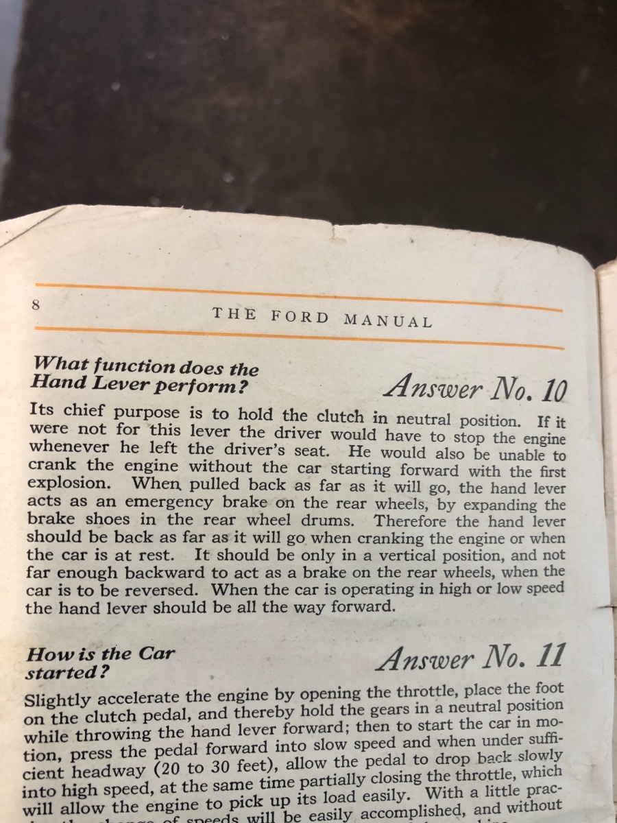 If you want to think of it as an emergency brake, fine. I have yet to even consider reaching down to grab the handle using it as such when making a panic stop. Don't matter if 21 or 30 in tires, skidding is not stopping and your transmission brake should be able to do that much. With the Model T steering you should have both hands on the wheel in an emergency more esp if rolling backwards. Now if you have it hooked up to the parking brakes, different story, well sort of.