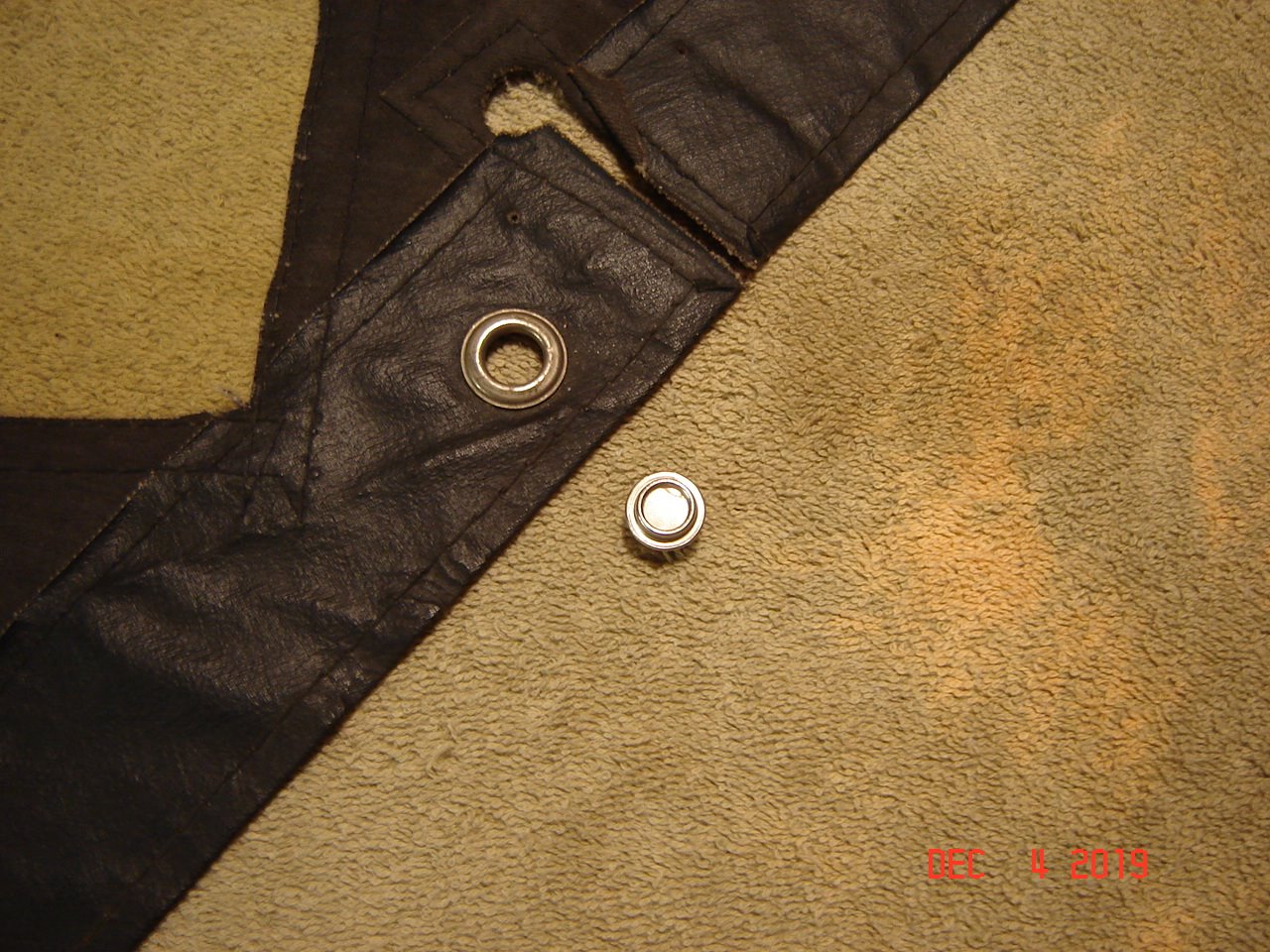 Even though this NOS side curtain is labeled for 1925, I think that it is actually for 1926-27 roadsters. The "sockets" that are installed inside the rear top bows on 1926-27 roadsters and tourings must have the extra lip to project through the grommets on the rear side curtains. ( I think Larry Smith identifies these as ANZO fasteners.) A similar "socket" without the lip is used on the body panel between the doors on 1926-27 tourings and also on the doors of most 1927 roadsters and tourings. If you use the socket without the lip on the inside of the rear top bow, the fasteners that are crimped onto the rear curtain will not snap into the socket when the side curtains are installed. That lip is to allow for the thickness of the grommets in the side curtains when it is "sandwiched" between the top bow and the rear curtain where it wraps around the back and fastens to the top bow. I think this type fastener is only used on the 1926-27 Model T's, but maybe it was used on Model A's, too. I don't know. See the photos of the sockets an how the grommet fits snug on that lip. The grommets have to be installed quite accurately in the side curtains to match the sockets.