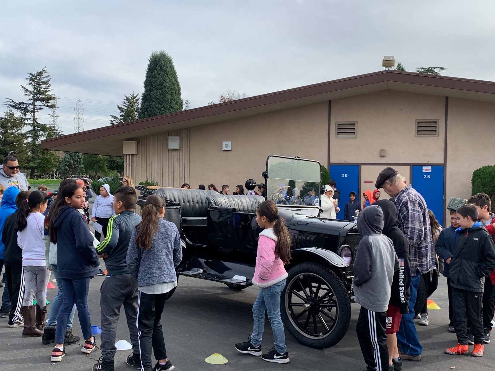 My niece, a 5th grade school teacher, saw our Model T at a doins' in San Jose in September and asked if I could bring it to her school to share with her class. They don't do field trips and she felt her students would really like it. How hard could it be? Drive the car there, let the kids see it and return home. Easy. Then I thought of all the information that they needed to hear about automobile history, Henry Ford and the Model T. How the Model T came to be and why it went away? So I prepared a half hour PowerPoint presentation on all that, a multiple choice 10 question quiz that they could take during the lecture where I indiscreetly provided the answers. Questions were things like "How many Model Ts did Henry Ford make?" I through in some humor, video clips, old time music and wore my fancy Model T outfit. I even promoted the MTFCA. By now, the word about the "old car" had spread and so five classes were attending, about 100 kids. We finished up with a question and answer session before heading out to see the car.