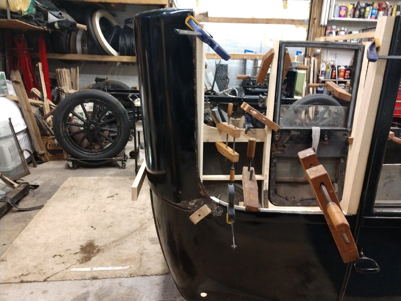 Ok looking at Johns last picture of the C-door, note the rear window swoop. This is what I am attempting to duplicate this morning. Opinions welcome, do you think I have the general idea? Still nothing is fastened or trued up. It also needs to be quarter round yet.