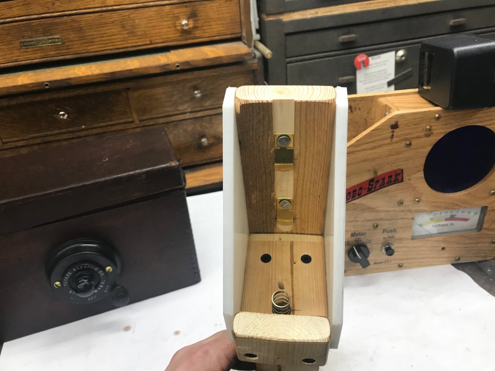 When the coilbox lid was changed to include a pair of notched strips that, together with the cam style latches, kept the coils firmly in place, this joint was no longer needed and was eliminated, although the thick side was continued, probably because of the cutting machinery. These units were then stenciled "L" and "R," probably for "Left and Right":
