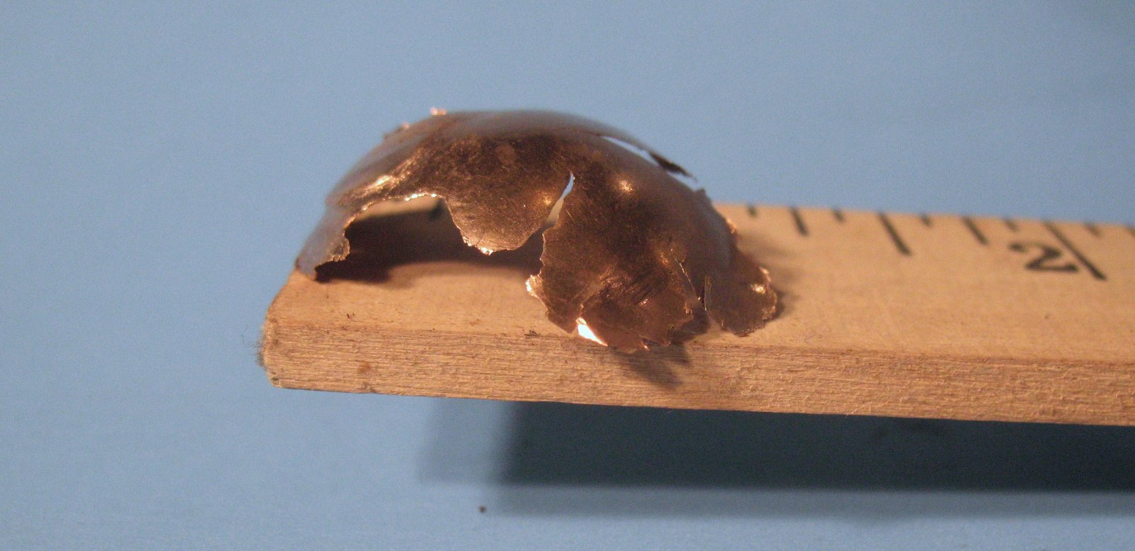 Funny, I just photographed this for my Anatomy series. This is what remains from an English penny, my coin of choice for the radius rod shim. It fell into several very thin pieces.