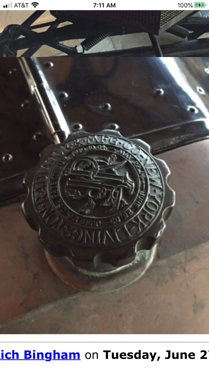 I've had this slightly mangled radiator cap for years. It says Livingston Radiator & Mfg Co New York and it is has a patent date of May 22, 1904. It is brass with what looks like brown bakelite moulded over the top of it. Has anyone seen on of these? Does anyone have a good one? Did the pointed Livingston radiators on Model Ts have caps like? I can't imagine many surviving. Like this one, the Bakelite has cracked badly.