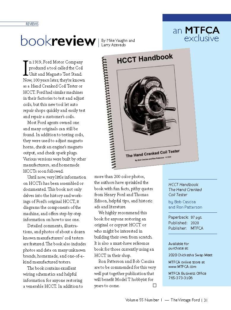 A little clarification concerning the "HCCT Handbook" is in order. The authors, Bob Cascisa and Ron Patterson, approached the MTFCA Board of Directors last year and told us they were planning on writing the handbook to document information concerning the HCCT. The offer to the board was to donate the rights and all sales of the publication to the Model T Ford Club of America. The board approved and the handbook is now available. Mike Vaughn and myself were asked to review the handbook which we did. To recap, Bob and Ron donated rights to the MTFCA and all profits from the sales support the MTFCA.