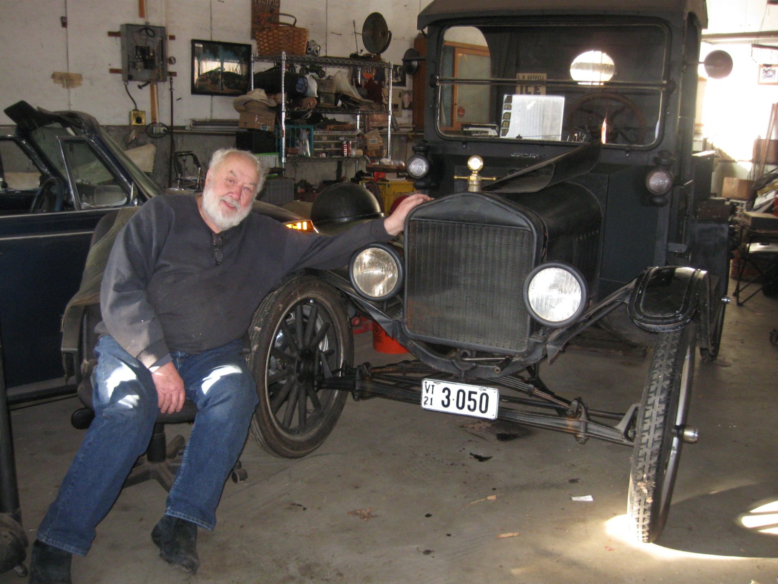 AFTER TWO YEARS SEARCH I WAS ABLE TO FIND A SET OF VERMONT PLATES FOR TRAGUTHER, AND MY NEW FRIEND BILL HARPER CAME BY AND TOOK THIS PHOTO, WE SAT IN THE SHOP AND HAD A GOOD VISIT TALKING T TALK. THAT'S WHAT I DID FOR MY T IN FEB, OH, I WANTED TO GIVE ER A CRANK UP, BUT SHE WOULD HAVE SMOKED US OUT. THANK YOU BILL .I WILL GET BUSY ON THAT HOGS HEAD NEXT WEEK [GUESS WHAT] I FOUND THAT HORN AND ITS NOT EVAN WED YET.