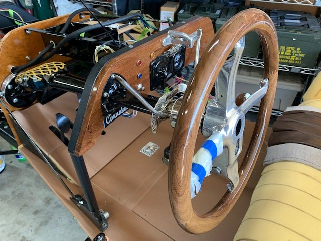 In line with Hank and Frank's comments on ergonomics, I'm building a modified Currier speedster....I am 6'2" - 275lbs and MaryAnn is a slender 5'11", so as you can see, there is a fit issue. The Currier Speedster has a very long hood and that requires lowering the steering column significantly, otherwise the steering wheel will be over your head. Things became even more complicated with the addition of a Vega steering box. At this point I threw up my hands and appealed to Hank Lee for ideas.....he had a solution within minutes. Please see the attached photos. Hank also brought up the idea of ergonomics and suggested tilting the seat back and installing tracks for adjusting the seat position. These tracks came out of a Ford F-150 and were modified the fit the width on my seat. The seat is hinged at the front to allow access to a custom tool box. The last order of business was the modification of a Spencer Fat Man steering wheel as once it was installed the bottom of the rim touched the seat cushion. Hank cut down the spider and had a 14" rim built to replace the 17" rim....et viola! I fit. Also, note the carriage steps...these were attached to a modified running board bracket and use the same frame holes for mounting.