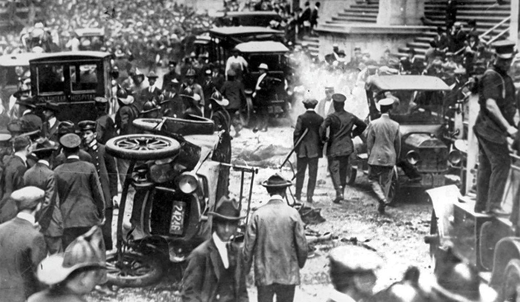 The Wall Street bombing was a terrorist attack that took place on September 16 1920 just after noon. According to Wikipedia, 30 people were killed by the blast, and another 8 died later of injuries. 143 survived serious injuries, and hundreds suffered lesser injuries. It was the most serious terrorist attack on US soil up to that time, but was exceeded less than a year later by the Tulsa Race Riots.
