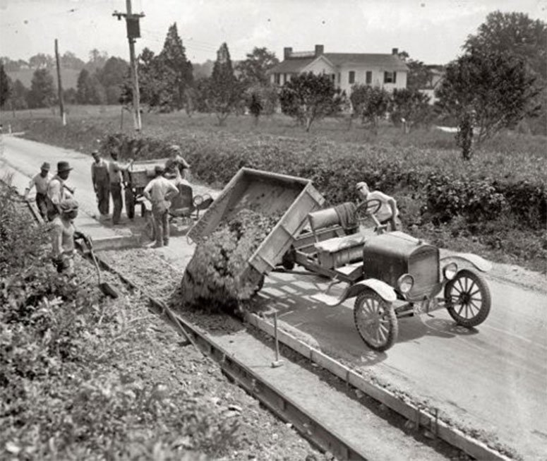 Here is a link to a Shorpy version of the photo I posted. The plate numbers suggest that the truck shown in the first picture in this thread has moved on. The next truck is unloading and a third truck is behind. {"Herr Dump Car Mfg. Co., 1925." A new sidewalk in Washington, or the capital's Maryland suburbs.} There are some nice comments with that article like "I was looking for a counterbalance when I noticed the rear wheels are farther apart than the front. Keeps it from tipping."