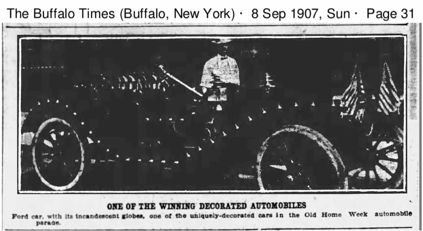 It took a few years, but I’ve finally located a newspaper photo of the 2nd place Ford, with lights along it’s lines: