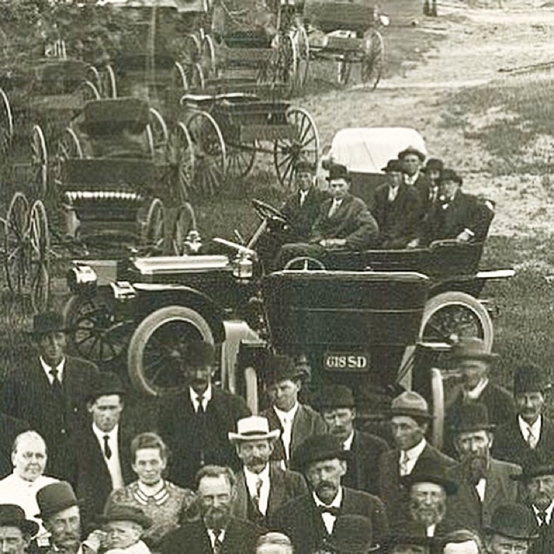This photo was taken near Baltic, SD at the 50th wedding anniversary of my great great grandfather's brother. Any thoughts on the make of the car that is sideways in the background? Leather license plate visible on a rear facing car indicates pre-1913 in South Dakota.