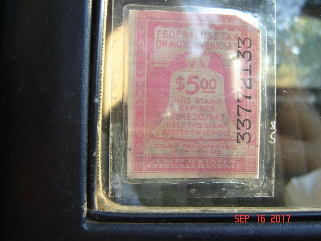 When I bought our original, low mileage, 1922 coupe from a local estate a few years ago, I tried to find some history on it with no success. On the lower corner of the windshield is a Federal Vehicle tax stamp from 1942. When I was cleaning the inside of the windshield, the stamp fell off. I made an exact copy of the original tax stamp and put the copy back on the windshield. That's when I remembered that there was an old DAV miniature license plate on the coupe's key chain. The license number written on the back of the tax stamp matches the number on the key tag, 39086. So, they have both survived together for 78 years