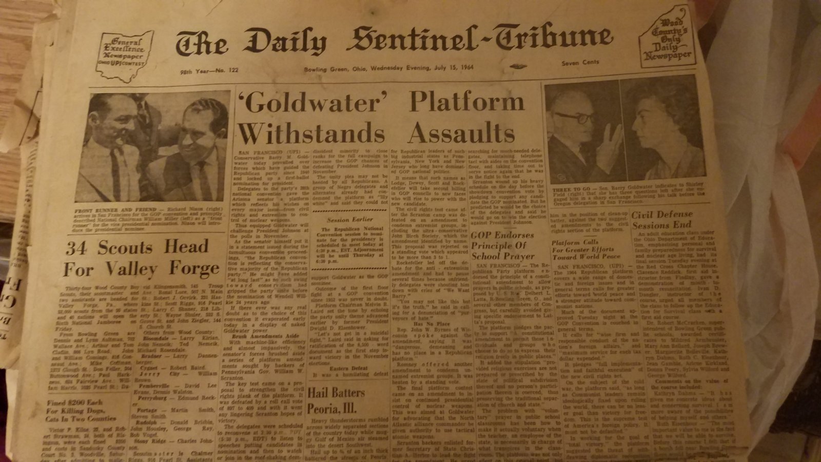 The previous owner found the side curtains rolled up in these newspapers from July 15, 1964. Richard Nixon and Barry Goldwater were headed to the Republican Convention.