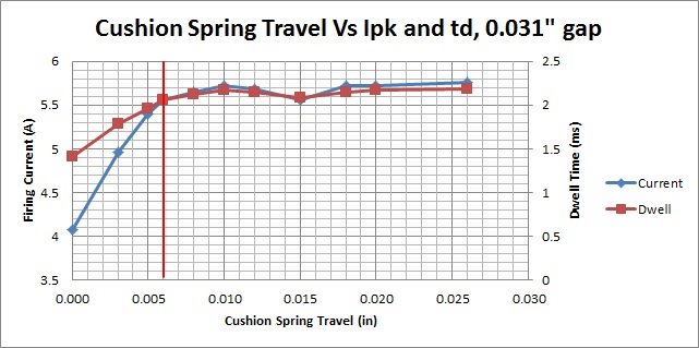 Here is data I took on cushion spring travel during development of the Electronically Cranked Coil Tester (ECCT) using a specially modified set of coil points with adjustable cushion spring travel.