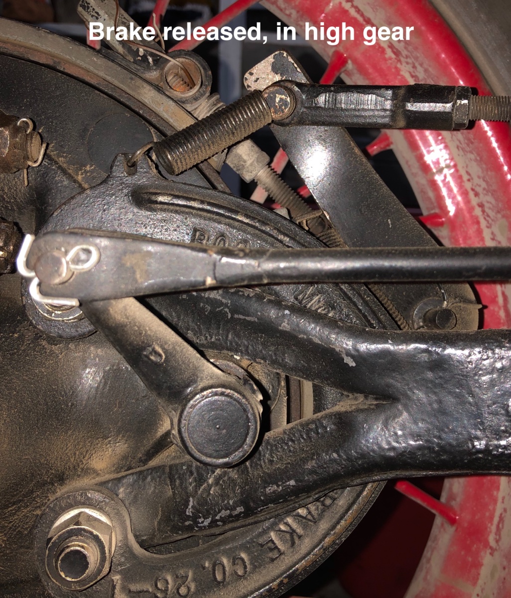 The 26-27 rods are shorter than all earlier versions which are around 54" or so long (so later ones are shorter than that). If you have the large drum late rear axle then I'd think your rods should be the shorter ones and just adjusted a little bit longer. So long as the car is held in neutral by the cam on the brake lever and you have somewhat of a neutral even if the lever is forward of vertical, that's fine. I give myself every bit of OOMPH room to sock the brakes down when necessary. If the lever is dead vertical and still in neutral with no brakes, you don't really have much to play with to get those brakes set.