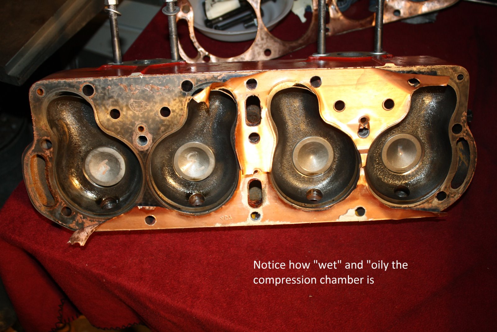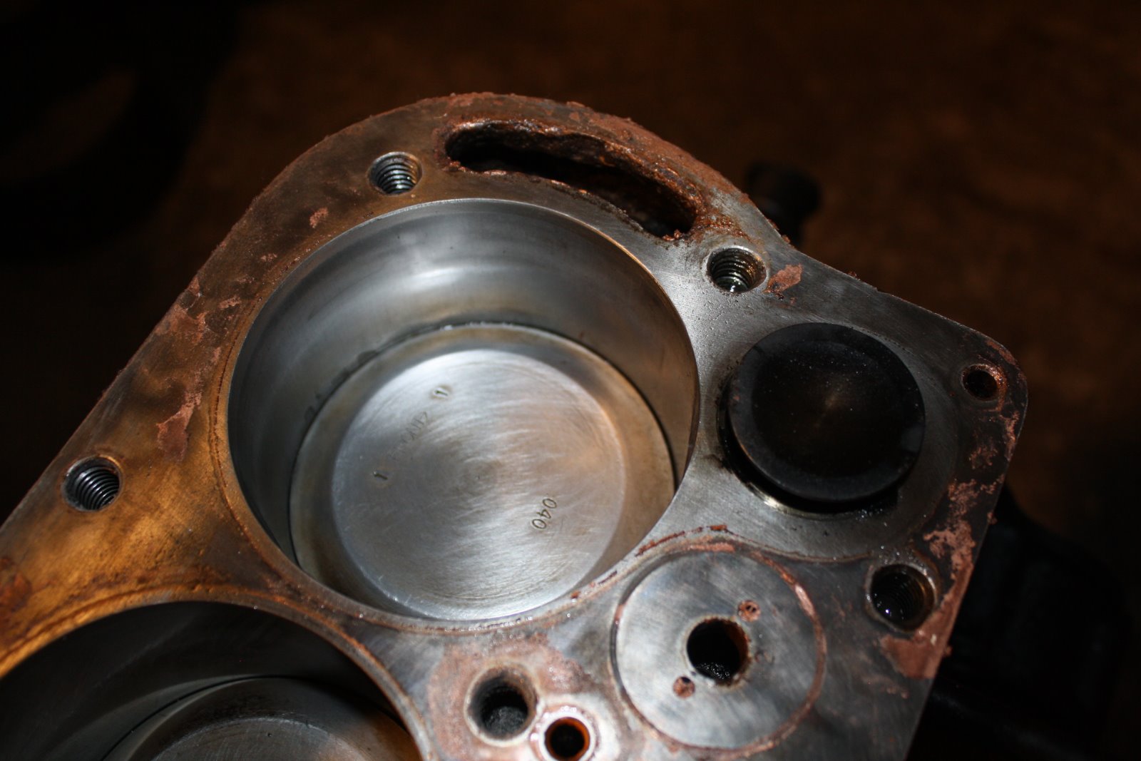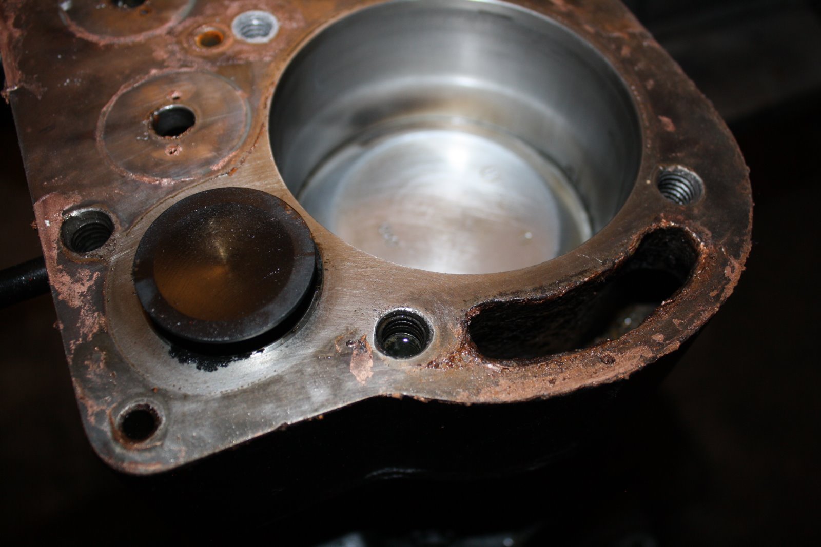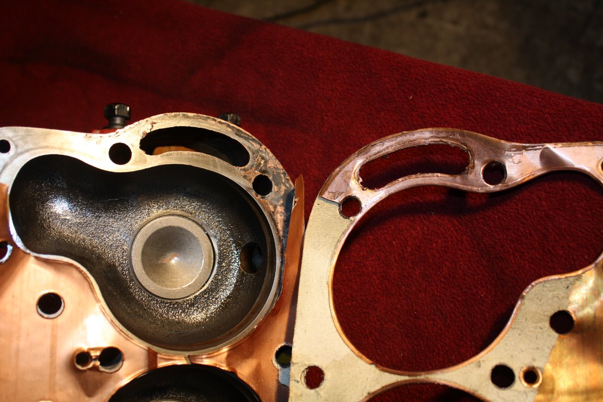 Well I got the radiator all cleaned out, pressure tested and installed. No leaks so it was time for a longer test run. The engine started easily, settled down to a nice idle, and things were really looking good. Then all hell broke loose. I noticed an oil leak near the passenger side crankcase arm. It is leaking between the two hogs head bolts at the front and rear of the arm. Not a little leak but a stream the size of a pencil lead. Not a drip drip type of thing but a steady stream. Then I noticed oil leaking out the threads of #1 spark plug. And about that time The front two head bolts started bubbling water... And then the %^$#@ rebuilt starter (I will not say what vendor it came from other than it was not Lang's) started pouring oil out the front of the starter. So it looks like I have a blown head gasket, and I will have to remove the engine to remove the crankcase and see what's wrong with the gasket ??. The crankcase was straightened on a pan jig so I do not have a clue how I could have that bad of a leak. Im not really sure if the oil at #1 plug is oil or oily water. I did every precaution when installing the head gasket and used guide pins to lower the head into place, so that is another "I do not have a clue what could have went wrong.