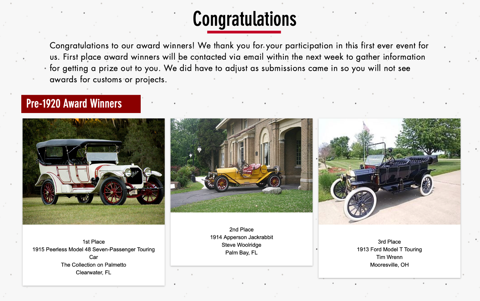 Congrats to Tim Wrenn for 3rd place Pre-1920 in the Gilmore Museum's Virtual Car Show!
