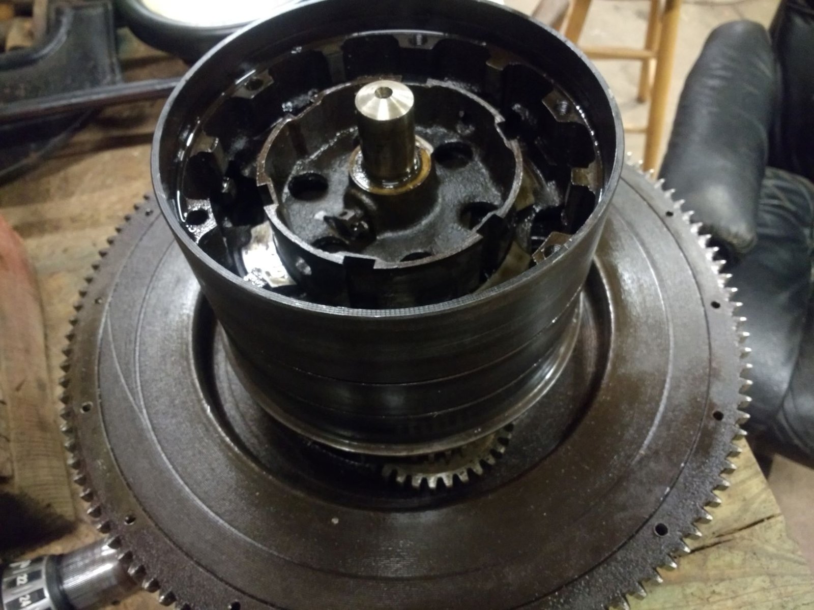 After finding a piece of lug shoe stuck to my magnets, I broke down the transmission to get a look. Sure enough, 1 shoe gone and all but 1 damaged in some fashion. I noticed while spinning the hubs to get a look at the gears, with the assembly sitting in the position shown in the pic, the reverse drum would brush the gears creating a soft scraping sound. So I grabbed the whole drum assembly and gave it a wiggle and it has some slop. If I deflect it in one direction, the gear set below also deflects out of its plane. I can do this around the drums to each gear set. Is it normal to have this type of "slop" in this orientation and at this level of disassembly? Or do I need to keep going?