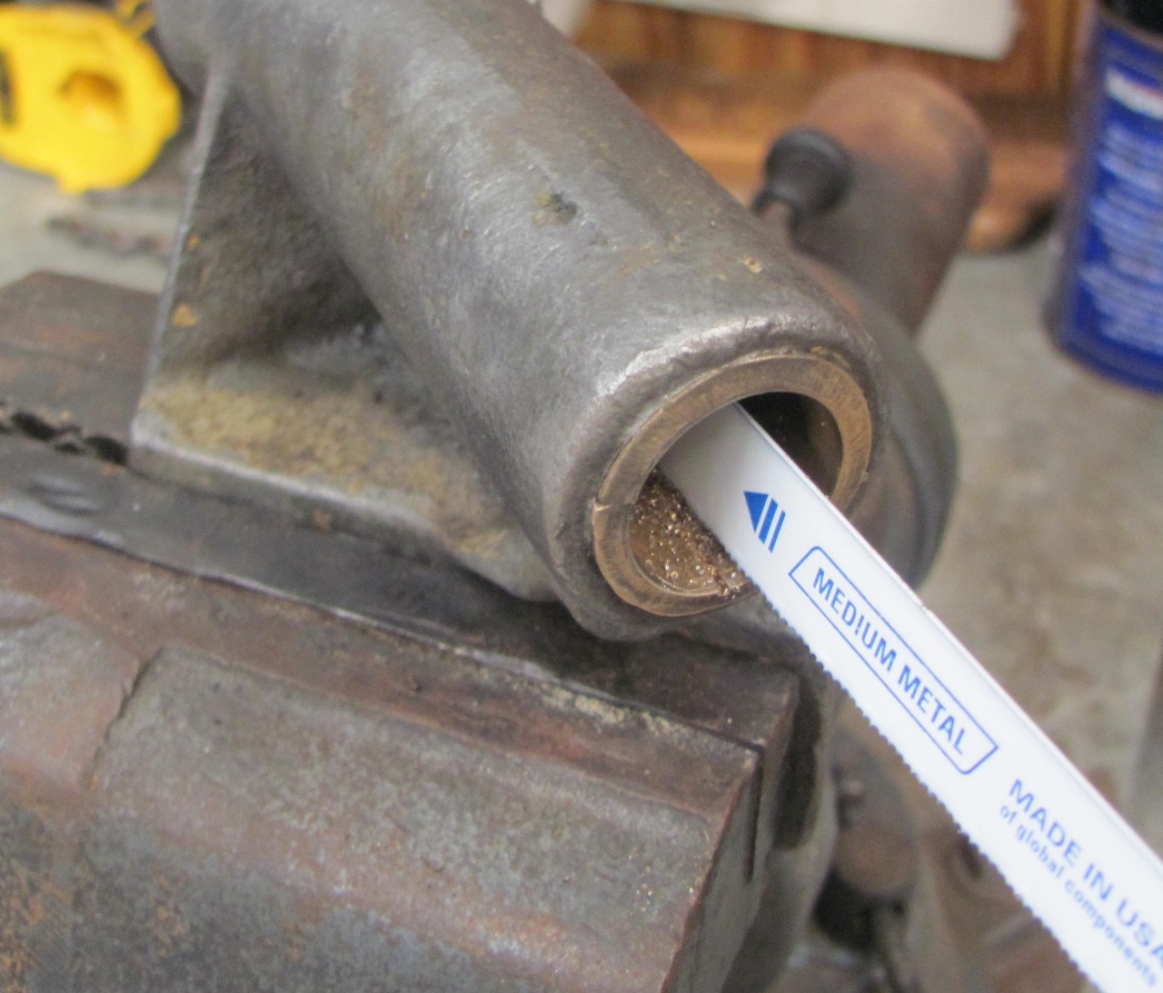 The bracket I have has one bushing at the lower end next to the pitman arm, and inside there is a bump in, like the thickness of another thin bushing, but it certainly doesn't want to come out. And hitting it with a hacksaw blade a couple times, returns steel shavings, not brass. well I can't say steel shavings but possibly the same material that the bracket itself is made out of.
