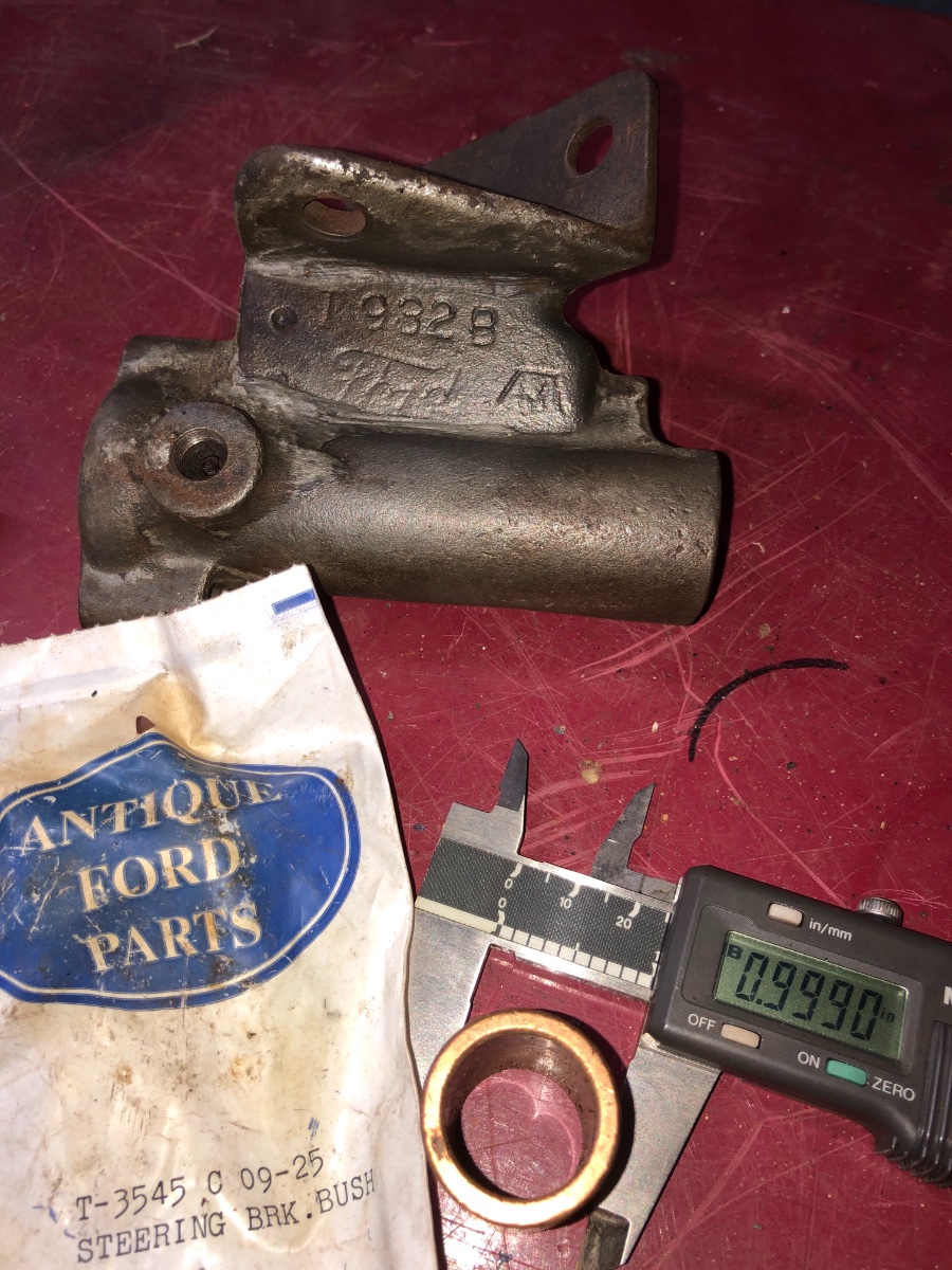 Looks like it's going back home to look at the shop manual again. My steering bracket is a Ford script T932B. after knocking the old bushing out it is obviously a way different bushing than the t 3545 c steering bracket bushings I got. The one pulled out is about 7/8 diameter OD, and the requisite 3/4 ID. The bushings I have are 1 in diameter OD, with 3/4 ID. So, looks like I need the t 3545 b2 bushings for a 26-27??