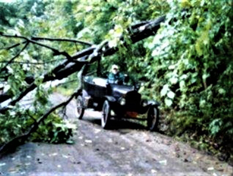 Tom had a very similar experience when on a Covered Bridge Tour, when he encountered a tree that had fallen across the roadway. It was remarkable to him since he had traveled the route the day before and the road was clear. Tom shared with me a photo of his experience, but didn't post it here because he wasn't satisfied with the resolution of the photo. The two photos remind me of the Hagerty Insurance motto: "Shift Happens", so I will post Tom's photo for him: