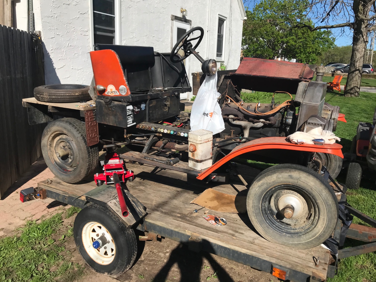 The front wheels are trailer wheels that are reversed. They drilled four holes in the hubs and welded the lug bolts to the back of the hub plate. The rear wheels are actually bolted and welded to the rear hubs. The rear end is a screw drive. Maybe from a TT ?