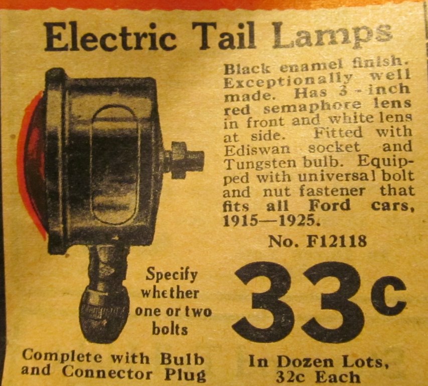 Ran across this adv. for replacement tail lamp for the Late model Fords, '25-'27 so maybe this aftermarket one uses the Bakelite thimble connector and bayonet socket for the bulb?
