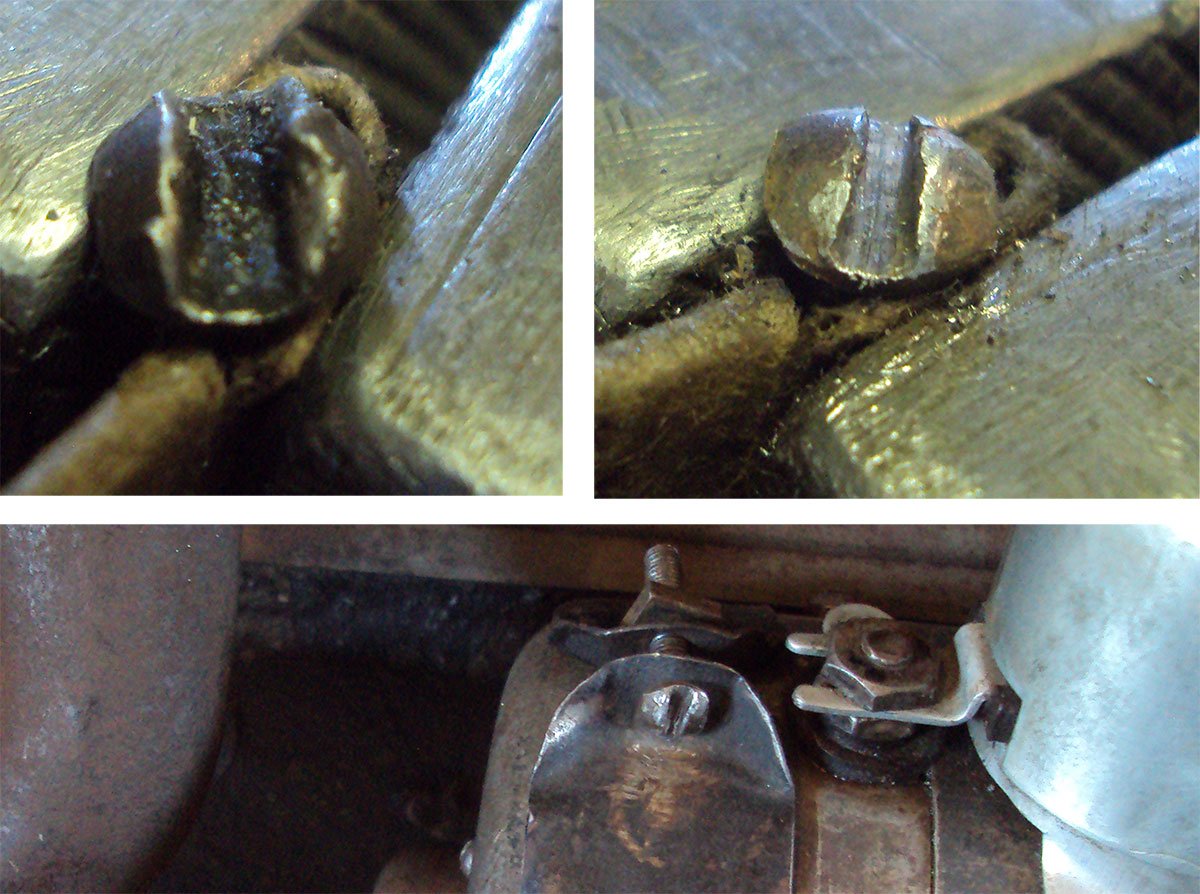 I will mention that if you have to remove the hogshead a Coupe with suicide doors is much easier than most other Ts. The doors swing out of the way giving wonderful access. While I'm at it I am oiling the cross shaft holes. these are one of the most neglected items and any time you have the floorboards out is a good time to give this attention. Maybe too insignificant to mention, but I will, are the starter and generator cover screws. Mine was buggered up as many are. I have zinc and nickle plated ones that would work but look out of place on this car. I decided it was worth the time to repair the slot. Metal isn't missing but pushed out of place. It isn't difficult to pound it back and file a bit to get a slot that works right. I have saved many original screws this way for what it's worth. Also, I noticed one was coarse thread and one was fine thread. Is there anyone out there who knows or cares what is really right?