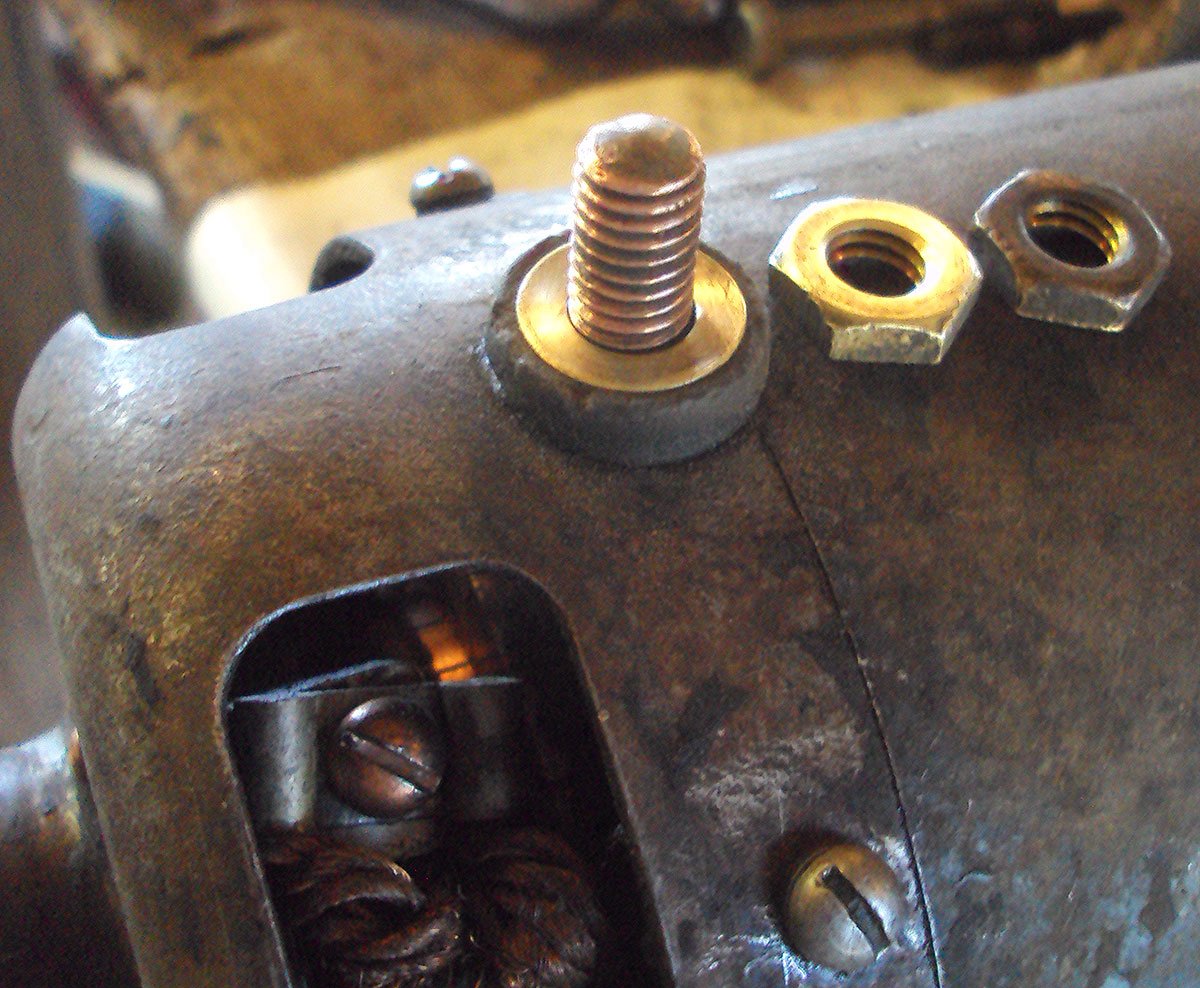 I could have had it back on the road but I'm taking time to clean things better and improve some areas. I have been cleaning all the electrical connections without disturbing the old tattered look outside such as the starter terminal. My plug wires look shabby but there is good continuity so I just clean the connector centers. We talk about choices. The bolt and stud at left were my first quick fix to hold the wishbone cap. I hadn't planned on driving the car that much so it seemed OK. A better choice now would be to use my original studs (center). I like to have original parts if practical. But as I won't be seeing them and one hole was stripped and tapped deeper I made two new studs to go there. The old studs have grooves worn by the cap and tired old threads but they are great patterns.