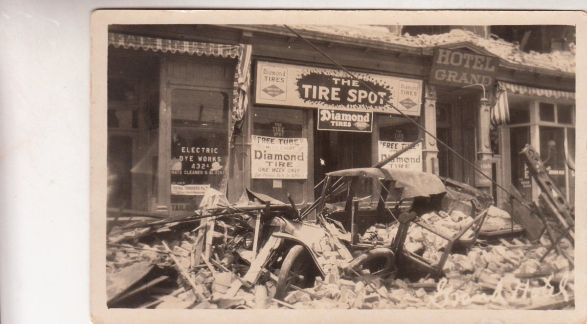The model T appears to be a center-door sedan (almost definitely!) The year of the car is in doubt, the front fender looks like it could be brass era, however nothing else indicates that. I just find it hard to believe a later fender could bend that direction from a hundred pounds of bricks from above? However, I found another photo online showing a different angle of the same car and buildings. It was posted on a University of California site, and identifies it as the "Santa Barbara Earthquake, 1925".