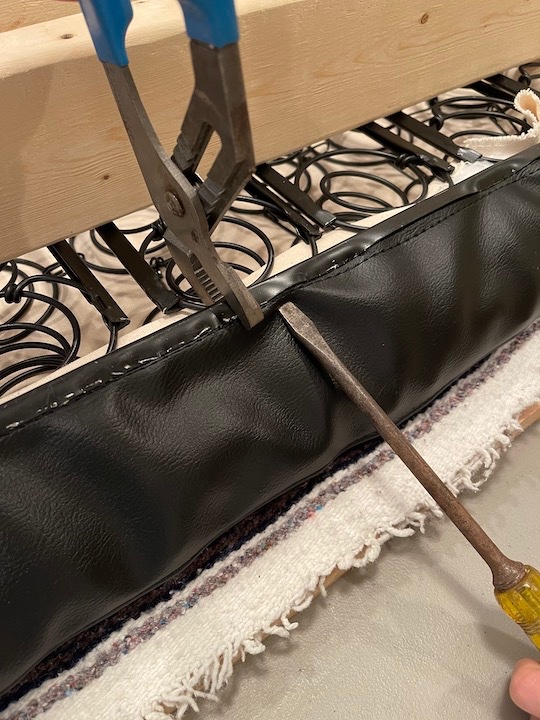Please consider using tacks and not staples. As you install the upholstery and the top, you'll want to make several adjustments to get the material to lay just right, with no wrinkles or buckling. Using tacks, you can pound them 1/2 way in, then easily pull them out if you need to re-stretch the material or adjust it in any way. Once everything looks nice and smooth you can drive the tacks down. If you use staples, you'll have a terrible time removing them if any changes are needed. If you think you won't need to make these little changes, then you've never installed a top" that way I won't hit screw heads when I staple the upholstery and top.
