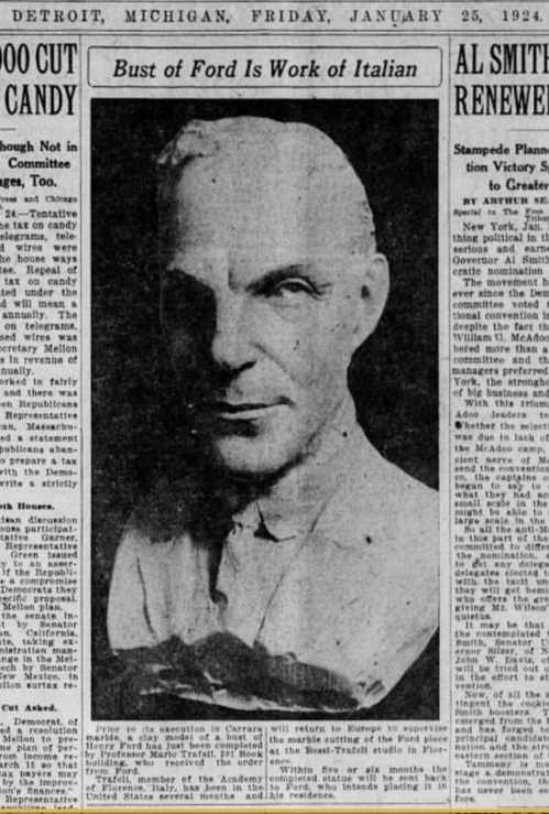 A while back, somebody asked me about the history of the Henry Ford radiator cap. I’ve lost the message so thought I would post this here. This newspaper clipping tells the story of the original bust commissioned by Ford. The artists name is prominently shown on the back of original ornaments, so I’m assuming they were connected to the artist. If anybody ever comes across an advertisement selling these ornaments, I’d love to see a copy.