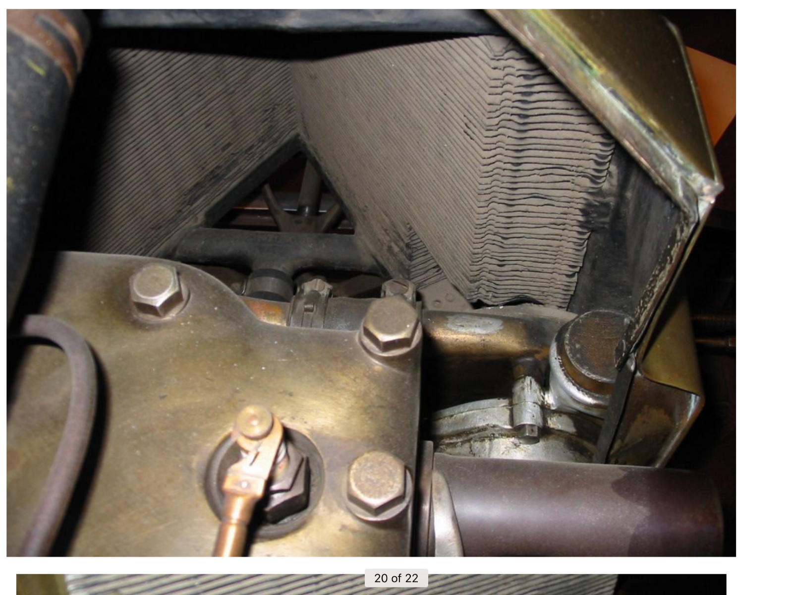 I think this 389 cu in racer will have an extended piece on the right front hood or radiator shell, as the 410 cu in does, to allow room for the running shaft for the magneto. The motor is just too big to allow a mag under the hood with such a large engine. On our 300 cubic inch motor, there is just barely room for a mag and the carb within the hood.