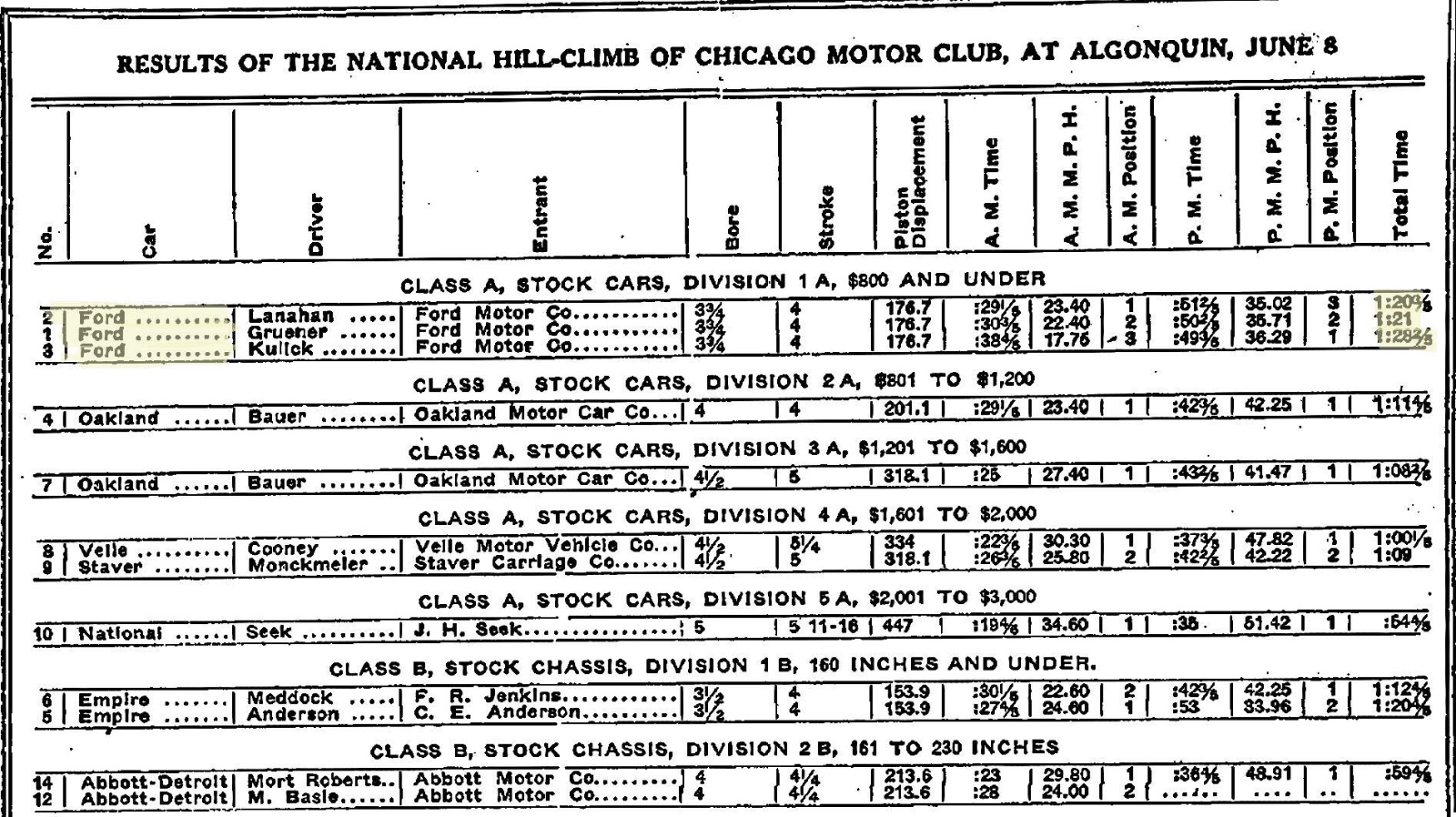 Then, the two Ford Specials, at 228 and 410 cubic inches. Some things to notice include the times (yellow). I also highlighted one National (green). It looks like the organizers had the cars change numbers as they competed in different categories. Both non-stock T’s are significantly faster than the stock T’s shown in the earlier chart. I think the organizers had the same car running in two or more classes (size class and unlimited class) change numbers, so each run would be documented, for the overall Agonquin Hill winner: