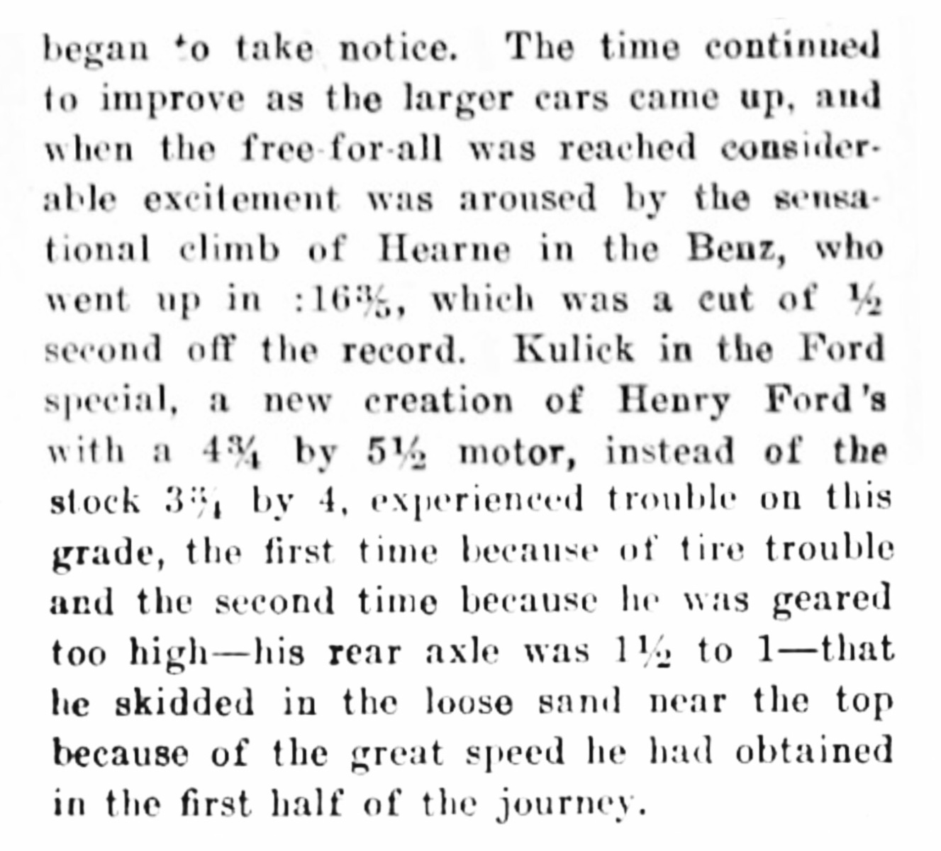 I’ve “puzzled” over this hill climb for some time. I think the writer of one of the the magazines “got it wrong.” Some reports say it’s a stock T driven by Gruener. Other’s say it’s the 228 cu in. driven by Kulick. I think part of the trouble is that there were 5 “Model T’s” participating in the hill climb. Three, including one driven by Kulick, ran in the stock class early in the meet. Let’s begin disecting this.