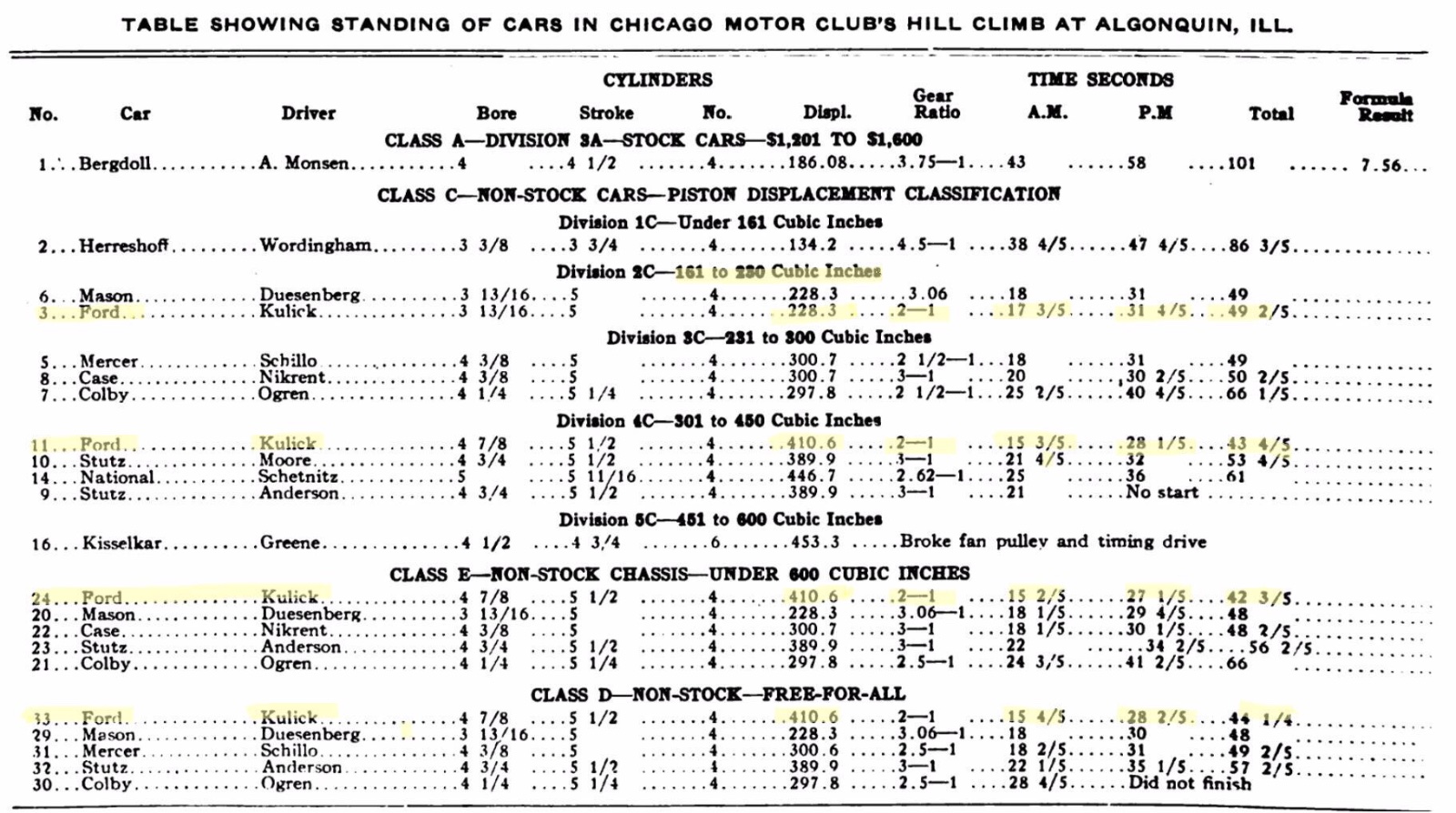 As this excerpt from “Automobile” along with stats read, Kulick and the stock Ford weren’t a factor in the race. At just over 135.6 miles, the Ford finished 2nd out of 3, and averaged about 50 mph: