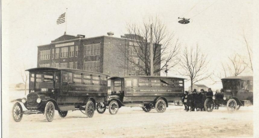 Nice Photo. It looks like "Brewster Public Schools" No.1 and No.2 on the sides. Massachusetts, Minnesota, New York? Any clues? And a '15-'16 Model T perhaps with a radiator cover. Looks a little chilly.