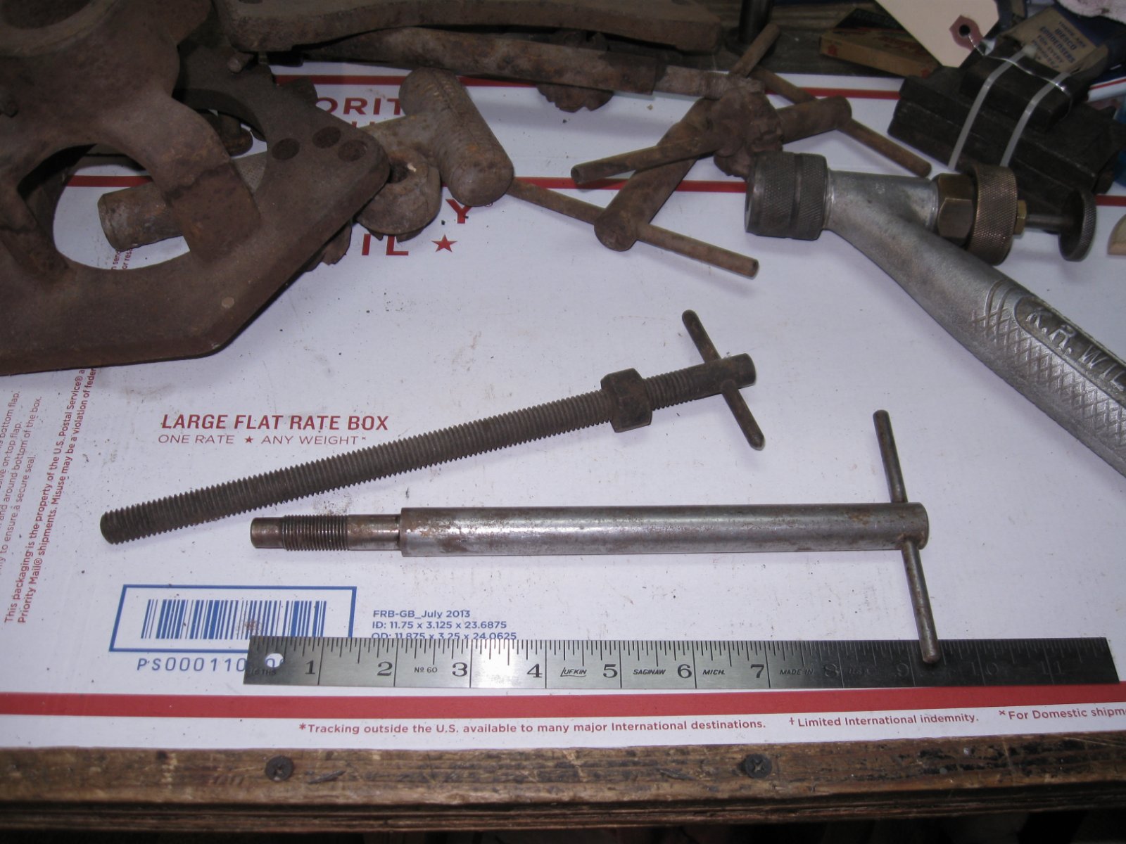 I have tried scouring the KRW catalogs, I have asked on other forums, KRW tool websites and have had no luck in finding out what these might be. The top one (fully threaded rod) I believe is from a puller, but which one I don't know. It is 10" long and is 1/2-13 with good black paint on the T-handle and nut.