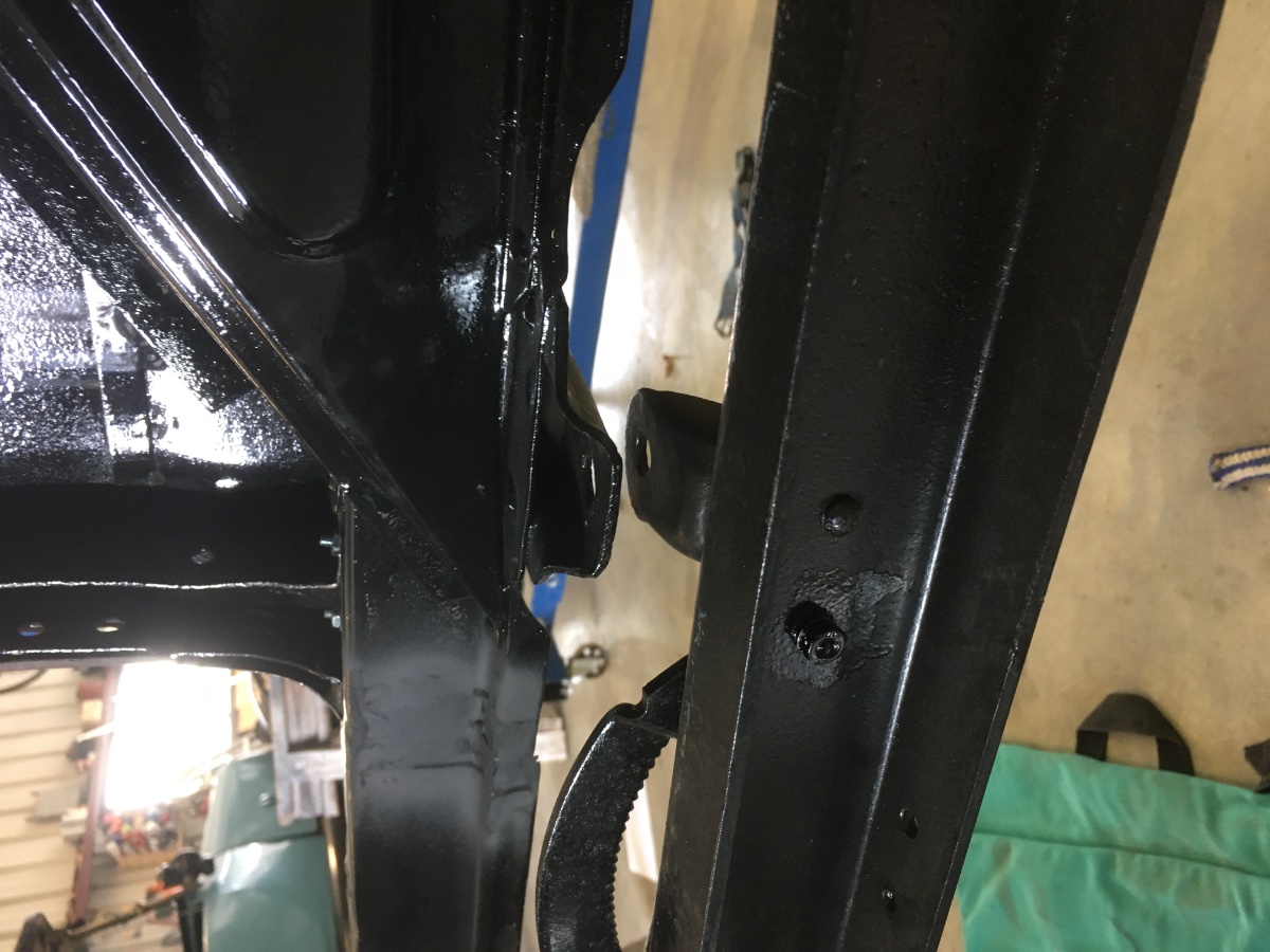 By frame replacement, I assume (or hope!) you're talking about body subframe? This was a first test fitting and I reckon I need to make sure the wood blocks sit down tight against the chassis when the body bolts are tight in the mounting ear. And I guess I can check the gaps where the wood blocks sit on the chassis frame and see if that gap matches the front mount gap? Should that space be equal?