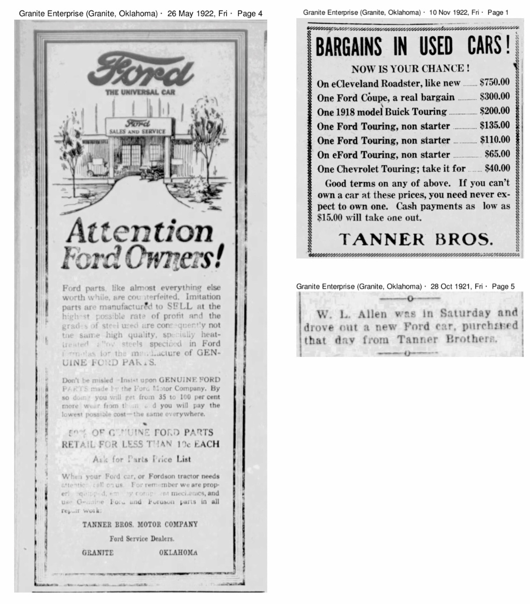 There was a “Tanner Bros.” Ford dealer in Granite, OK, about 90 miles west of Chickasha. It looks like they were a garage for a few years, then picked up a Ford dealership in 1921 or 22: